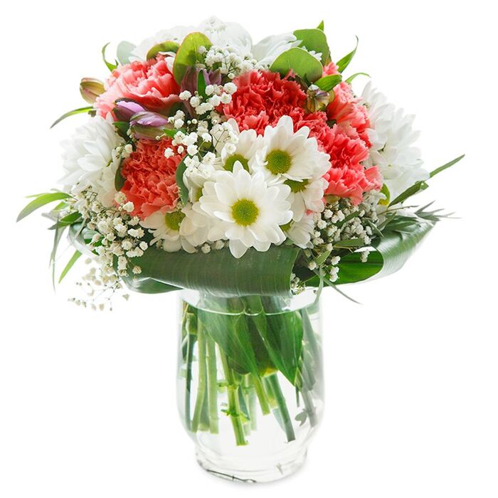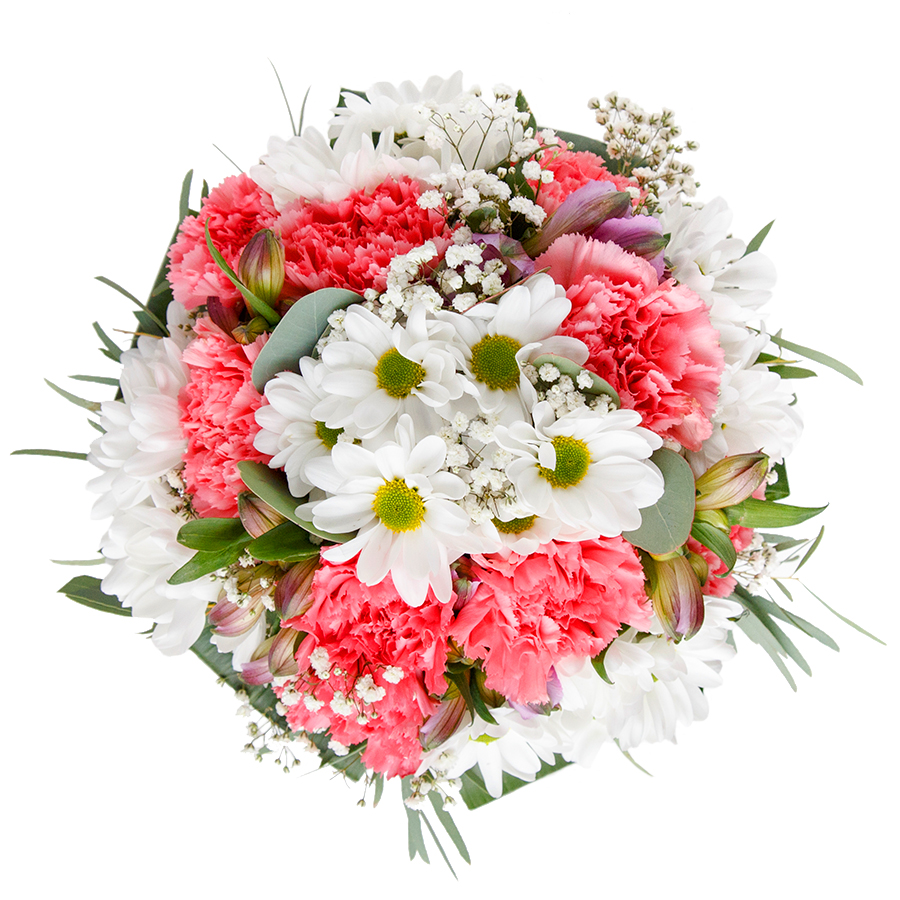 Delight in the beauty of our white and pink floral arrangement, featuring an elegant mix of white chrysanthemums, soft pink carnations, delicate gypsophila, and vibrant aspidistra leaves. Each bloom is hand-selected to ensure exceptional freshness and quality.